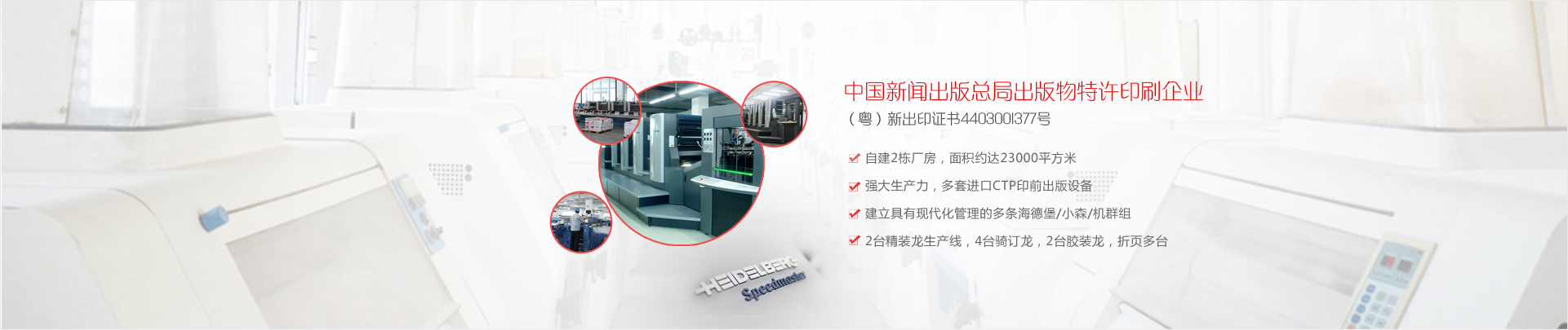 公司實力雄厚,設備先進。 聚集了許多高等院校的尖端高級印刷專業(yè)人才,擁有國際頂尖的、全球最大的成套印刷設備— - 德國海德堡-對開四色、五色、雙色、單色、四開四色機等的主體印刷設備, 擁有高水準后道加工系統—— 全電腦控制的斯塔爾折頁機、 STAHL 自動折頁機、 全自動鎖線機、 全自動騎馬訂聯動機、馬天尼膠裝龍、 程控切紙機、環(huán)保型過膠機、啤機等 精良裝備,整套印前印后設備。